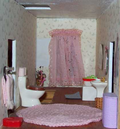 The bathroom curtains were made from a pink lace handkerchief gathered onto a wooden stick. The toilet paper rolls on top of the toilet were made by wrapping thin strips of pink toilet tissue around a small tube (a coffee stir or small straw would work also). The toothbrush on the sink was made from a thin piece of wood with the bristles painted white.