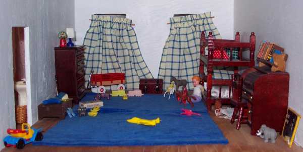 The toys in the boy's room are miscellaneous real toys. The lamp on the dresser (left) is a blue game piece with a toothpaste cap on top.