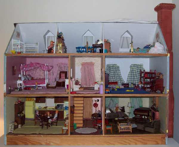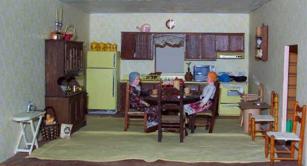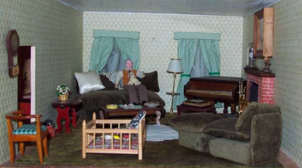 Much of the furniture was made by my mother, father and myself from kits and patterns. This includes the living room sofa, chair and fireplace; and the kitchen counter, cabinets and china cabinet.