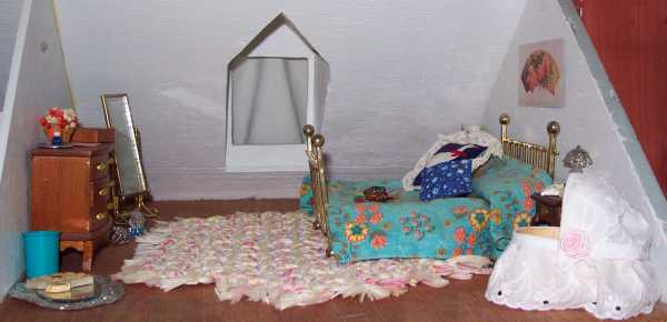 The computer table (right) was made from a kit. The blue table and chairs (back right) were a gift from one of my grandparents' trips abroad. The black waste basket (right) is the cap from a highlighter pen. The bird cage (left) is a Christmas tree onament. The room dividers in the attic were made by my husband to my specifications.